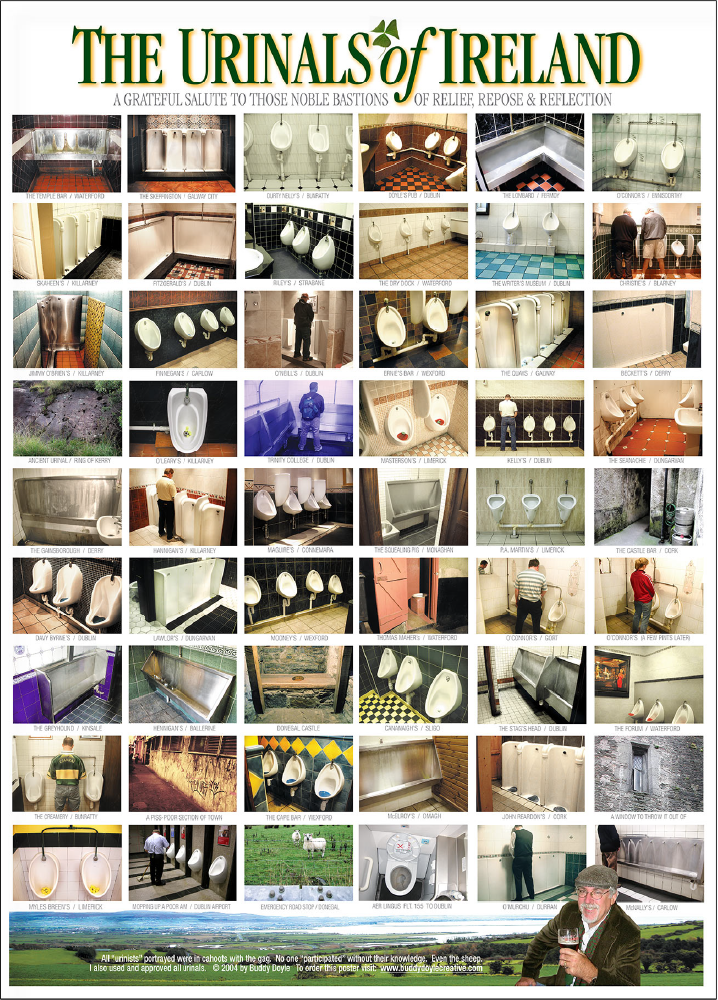 My signature photography/design piece, the inimitable Urinals of Ireland. It can be safely said that I am, without question, the undisputed "Prince of Porcelain" - indeed, "The Duke of Drains". Several (unaccredited) universities have offered me an honorary doctorate in Urology.